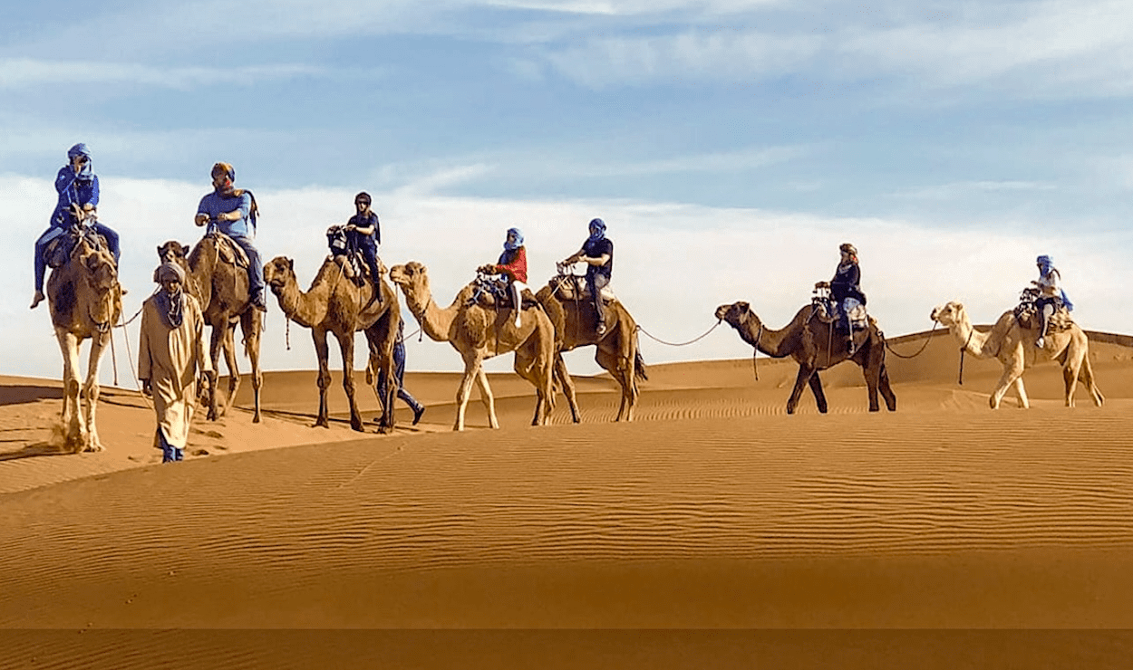 After breakfast, continue through desert gateway towns and oasis landscapes toward Todra Gorge, where towering canyon walls create one of southern Morocco’s most dramatic natural sights. After time to walk through the gorge and enjoy the scenery, drive onward to Merzouga. In the late afternoon, meet your camel caravan and ride into the dunes of Erg Chebbi as the sun begins to set. Arrive at camp, settle into your tent, enjoy dinner, music, and a memorable night in the Sahara.